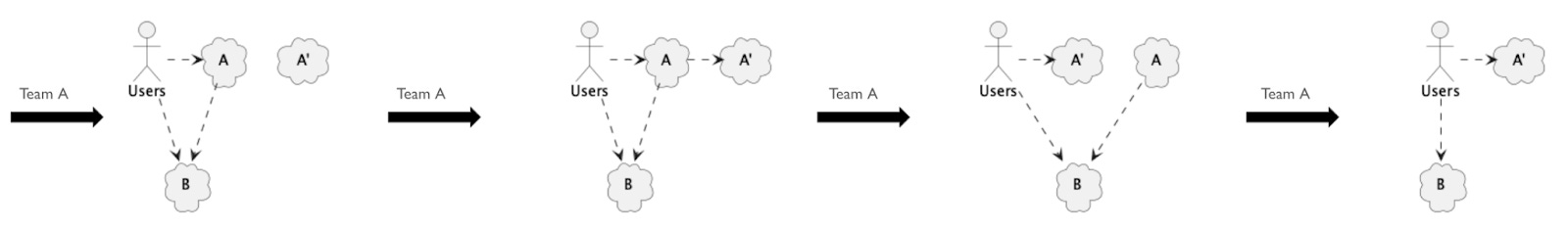 Team A deploys A’ into production and runs it in parallel with A. Users are still using A.