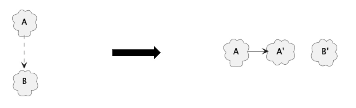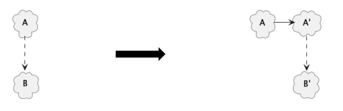 If we need to keep the dependency, we have two options. The first is to make A depend on B’ instead of B. This requires a change in A as well as B.