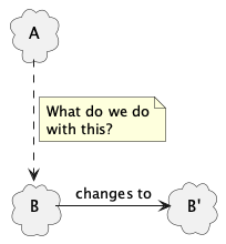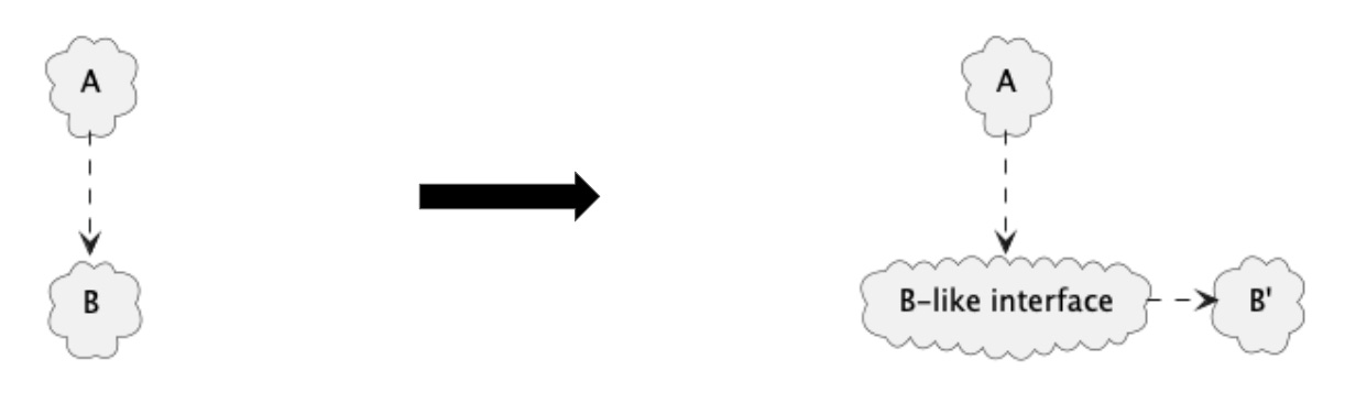 The second option for keeping the dependency is to create a new thing that looks like B and have that depend on B’. This does not require a change in A, but requires a new thing to take B’s place.