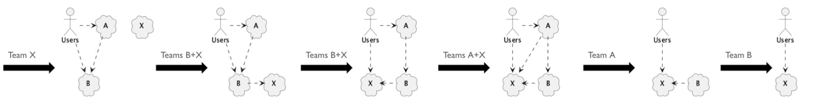 Team X deploys X into production and Teams B and X work together to run B and X in parallel