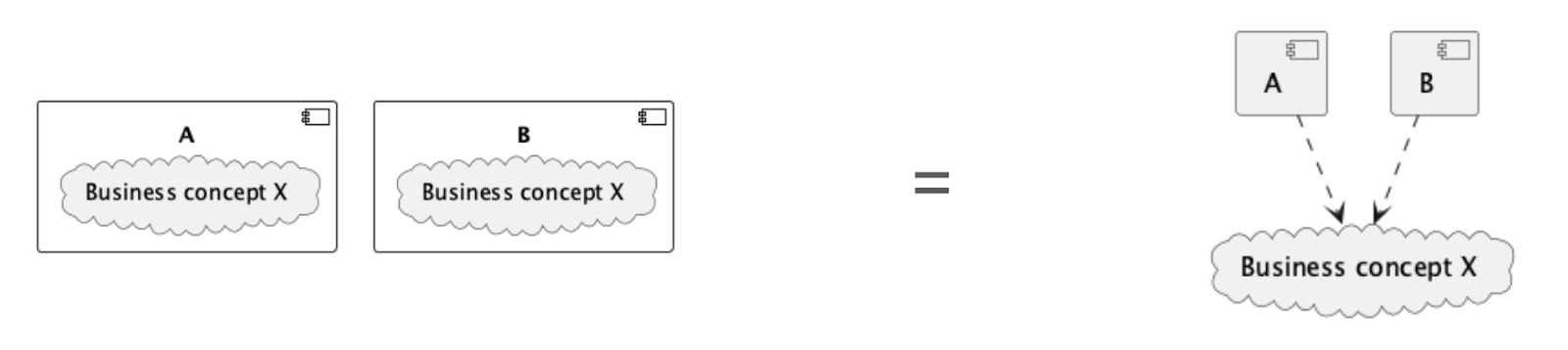 Example: Components A and B both containing a business concept in the same way (they make the same assumptions about it) is functionally the same as an external/explicit dependency. This is true because, in both cases, if the concept changes sufficiently, both A and B stop working.