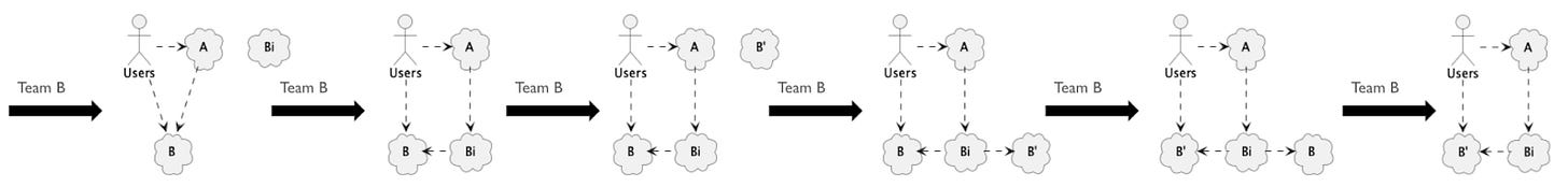 Team B deploys B’ into production and runs it in parallel with B (via Bi)